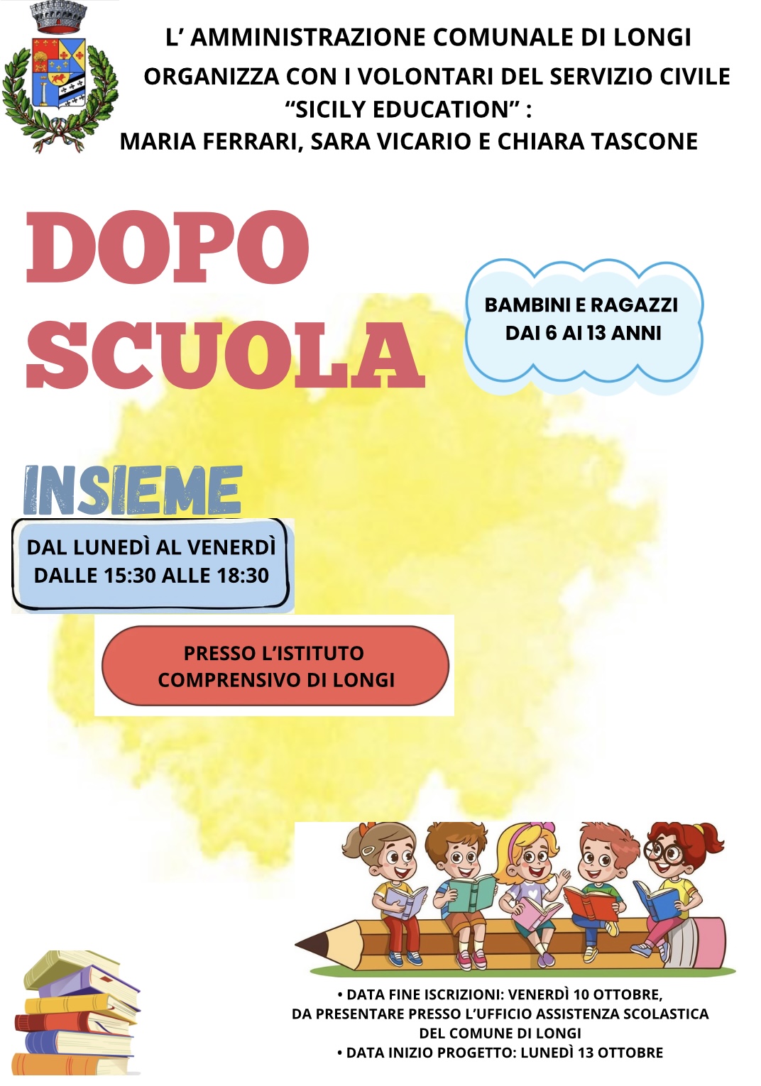 L'Amministrazione Comunale di Longi organizza con i volontari del servizio Civile " Sicily Education" .....Dopo Scuola Insieme..... per bambini e ragazzi dai 6 ai 13 anni dal lunedì al venerdì dalle 15:30 alle 18:30 presso l'Istituto Comprensivo di Longi